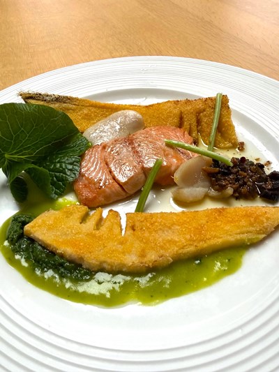 『山形県の魚 桜鱒と春孟宗のグリル〜名水が育んだ大富本わさびソース〜』です。1992年に「山形県の魚」に選ばれたサクラマスは山形県民にとっては春の訪れを告げる魚です。名前の由来は春、桜の季節に川に上ってくるから、あるいは身の色が桜色だからなどといわれています。ヤマメもサクラマスも、川でふ化するところまでは同じですが、そのまま川に残るものがヤマメで、一方、ふ化した後1年ほど川で過ごしたあと、海へと下っていったものがサクラマスになります。この時期の脂ののったサクラマスのおいしさはマス類の中でも最高と言われています。今月お魚ランチは、旬のサクラマスと筍のグリルでございます。筍はひと手間かけてパルミジャーノ・レッジャーノを纏わせました。さらに旬の平貝も添えてございます。そしてソースは、名水百選「小見川」で育てられた大富農産本わさびを使いました。本物のわさびは、さわやかな香り、甘みのある辛味、ツンと鼻にぬけ、そして素材を引き立てます。山形の春、山形の旬を味わうランチを是非お楽しみください!