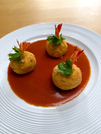 『海老ボールクリーミーコロッケ〜海老ときのこのビスクソース〜』です。今月はまず見た目がとってもかわいい!まんまるの海老ボールのコロッケです。丸い形に海老の尾がピョンと付いている形がなんとも愛らしい…食べるのがもったいない…もちろん見た目だけでなく、手間暇かけたベシャメルソースにプリプリの海老のむき身と舟形マッシュルーム、しめじ、舞茸など秋のきのこがいろいろと日替わりで入っています。見た目も味もこだわった一皿です。そして殻まで使った海老の旨味ときのこの旨味が入った、錦秋を思い起こさせる真っ赤なビスクのソースとの相性も抜群です。パンにもライスにもとてもよく合います。たっぷりとつけてお召し上がりください。